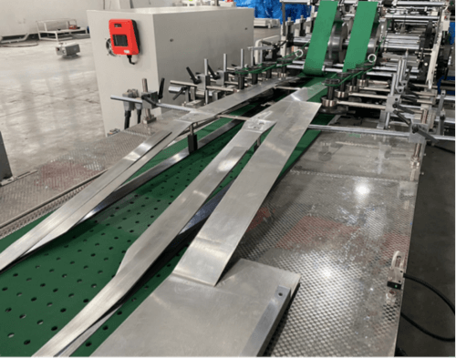 Sección de alimentación automática de hojas, fácil de cambiar el tamaño para un tamaño diferente. | El diseño del gabinete lateral se utiliza para lograr la corrección de desviación de papel | Las piezas de arrugas automáticas, si el grosor de papel kraft es inferior a 200 GSM, la máquina puede hacer el arrugado automático en línea. | Sistema de pegado automático en la función de la tarjeta superior. (Opciones) |