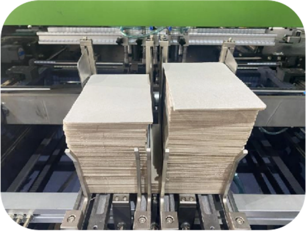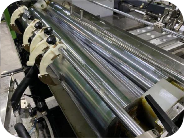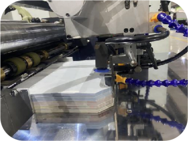Alimentador de placa sin parar Alimentador controlado por servomotor, adecuado para placa de papel de espesor de 1-4 mm. | Cabeza de succión Adopta la cabeza de succión para entregar el tablero, independientemente del tamaño del tablero, lo que facilita el cambio de tamaño. | Comedero de tela Alimentador controlado por servomotor, adecuado para el peso de la tela 120-300 g en papel material, cuero, tela, PVC, PP, etc., que puede ahorrar alrededor de 15 minutos cada hora para agregar la tela. | Rodillo de pegamento de gran diámetro El sistema de calentamiento del ciclo del agua interno del agua, la temperatura del rodillo constantemente se vuelve más delgada, más estable y mejor pegado de viscosidad. Necesitará 30 minutos para el precalentamiento, lo que puede ser controlado por el sistema de control remoto móvil. |